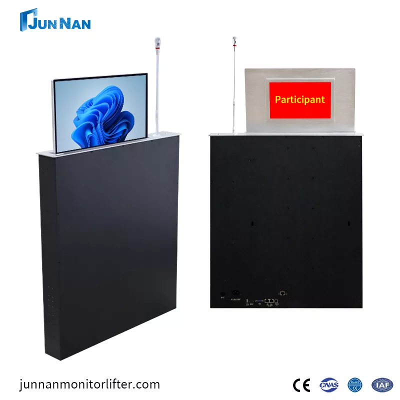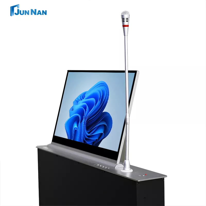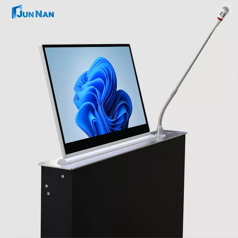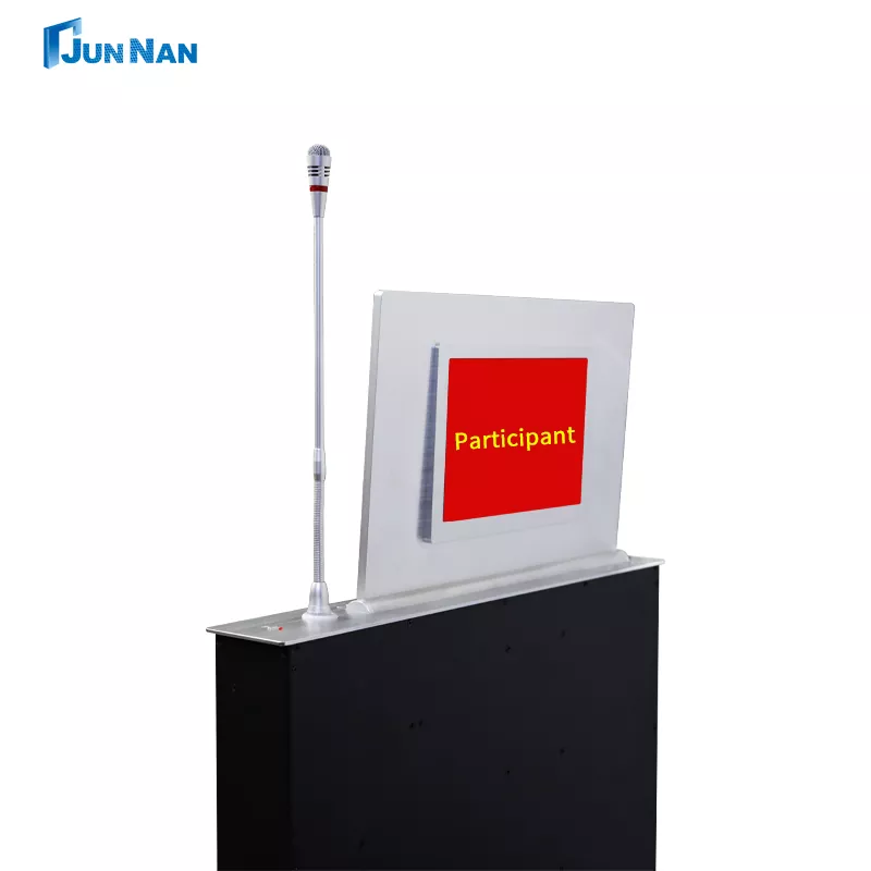 Усъвършенстваният повдигащ екран за конферентна маса е подходящ за всякакви сцени, разполагаме с технология за рязане с CNC машина и лазерна технология, най-новата технология за повдигане на конферентна маса, за да гарантираме, че продуктът е с ултрависоки стандарти. Всички наши повдигащи се екрани за конферентни маси принадлежат на Произведено в Китай, налични са за покупка на едро, могат да бъдат персонализирани за клиенти и разполагат с достатъчно повдигащи се екрани за конферентни маси на склад, поддържащи бърза доставка до клиентите. И нашето оборудване junnan има различни сертификати за сертифициране като CCC, CE сертификат, ROHS, ISO сертификат, продуктът е безопасен и висококачествен, с квалификация за износ, е директна фабрика с изгодна цена, има собствена фабрика и работи в продължение на много години.